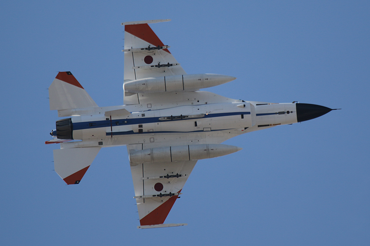 岐阜から飛んできてハイGターンを見せるXF-2A。 すぐ近所だけど大きな増槽を左右に抱えている |