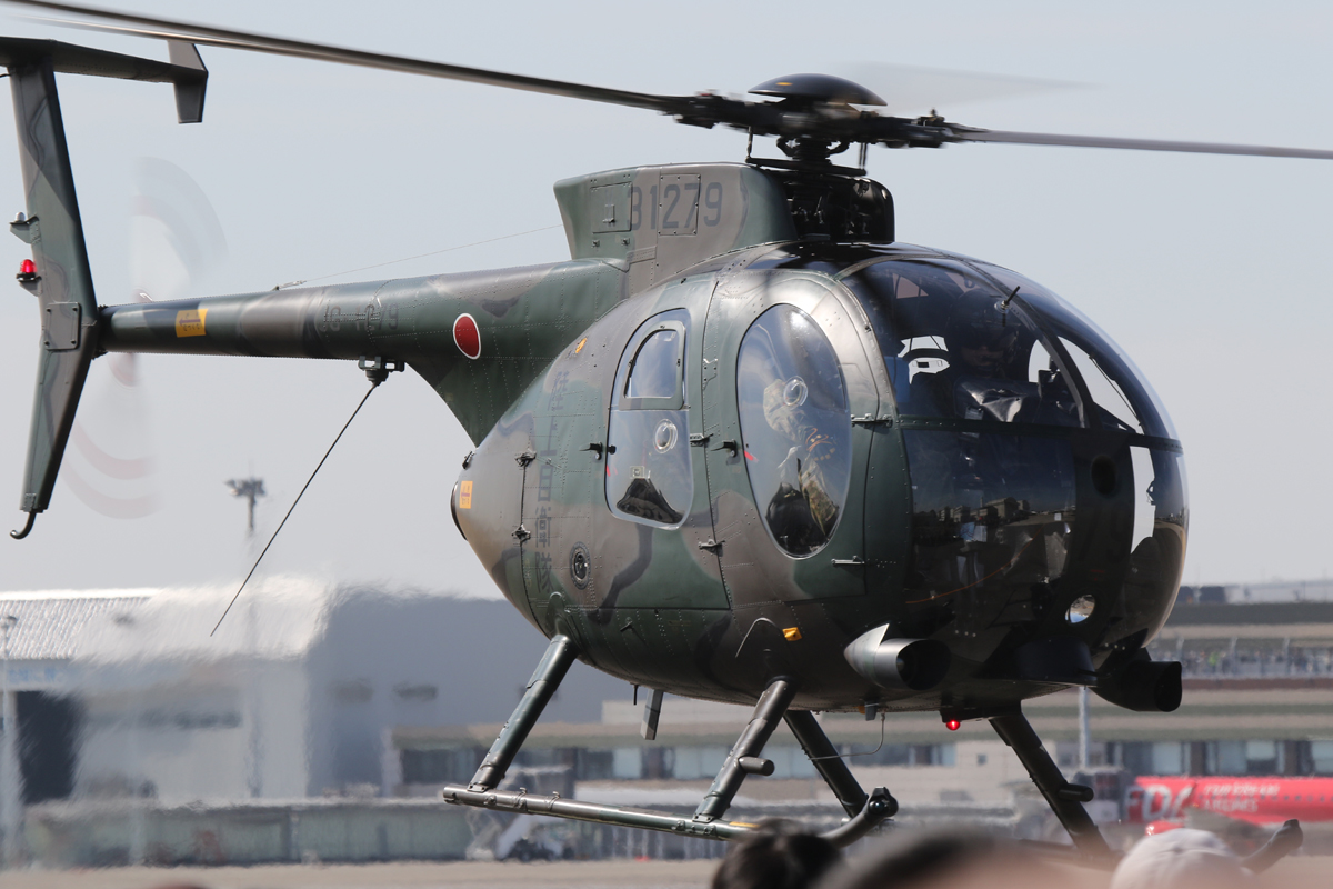 陸自明野基地から応援のOH-6が離陸。 すっと浮かんでくるっと回る軽快な動き |