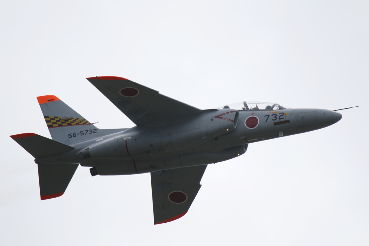 浜松から飛んできたT-4。尾翼の市松模様の帯の下に赤い線が入るのは第32教育飛行隊の所属機 |