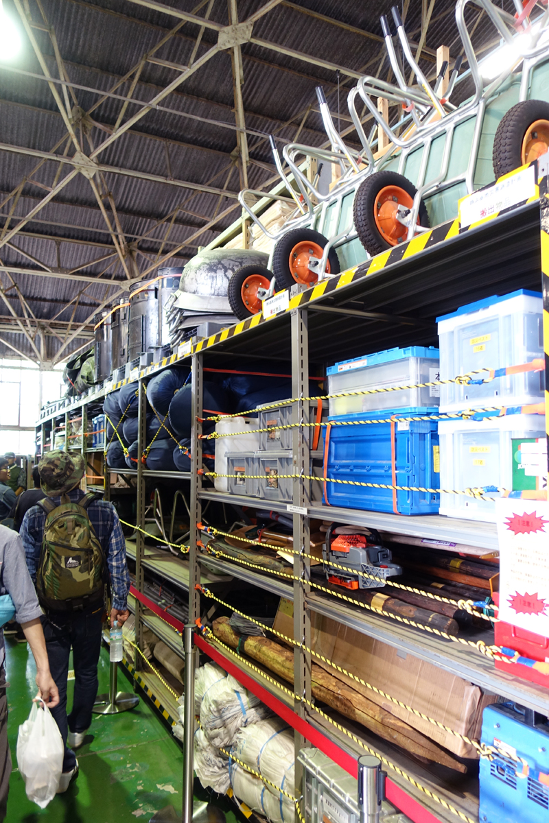 エプロン端にあるかなり古いハンガー、例年閉まってるそこが今年は開いていた。 中身は災害派遣に使う機材の保管庫でした |