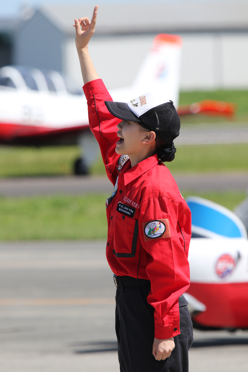 T-7jr.「リトルウィング」の演技はブルーの後のショーストッパー。 今年は飛行前点検をギャラリーと一緒にする趣向で、その解説をするお姉さん |