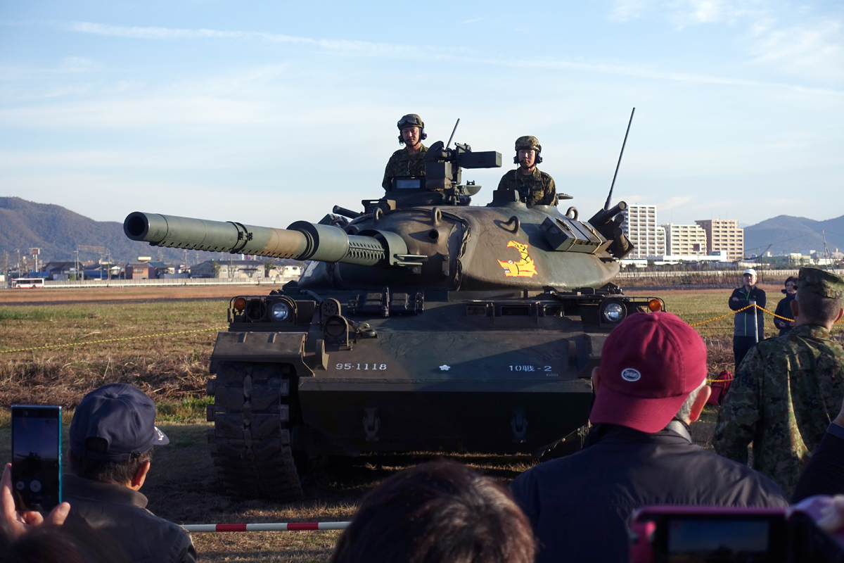 空自のお祭りでは珍しい戦車の展示は滋賀の今津駐屯地にある第10戦車大隊の74式戦車。司令部が名古屋なので金鯱のマークつき |
