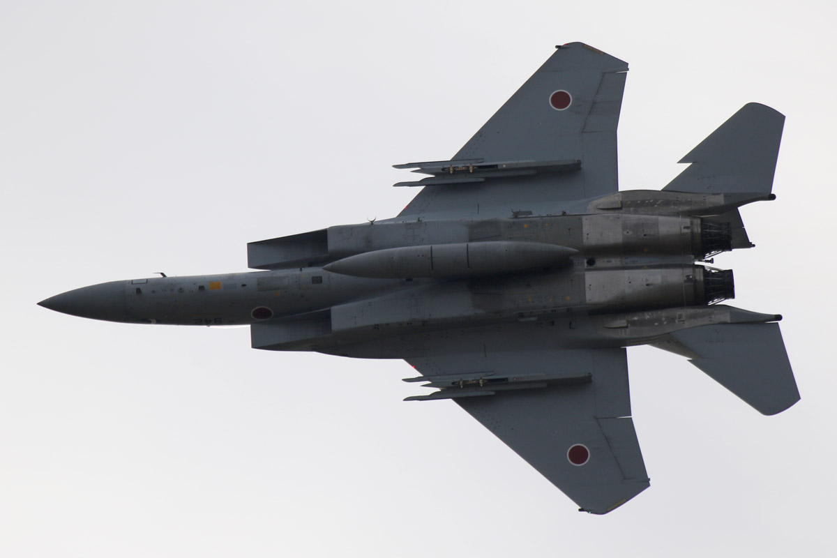 午前のデモで飛ぶF-15J。 最近この基地を舞台にしたアニメのあった関係で目が描いてある |