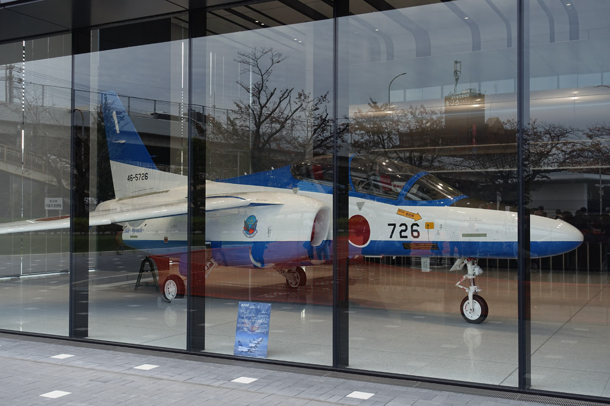 岐阜祭は何年か前から名鉄三柿野駅への撤収ルートに隣接の川崎重工岐阜工場の敷地内を通る様誘導されるのだが、最近完成した新社屋にT-4が展示された |