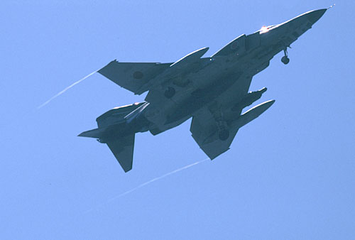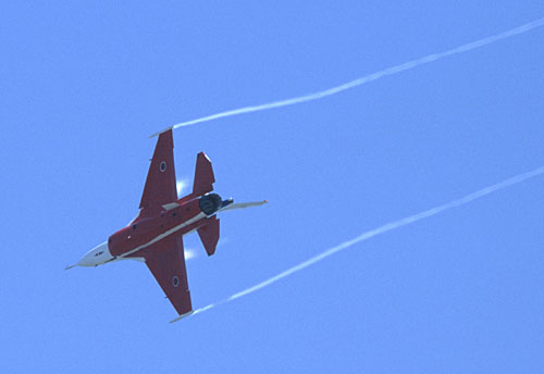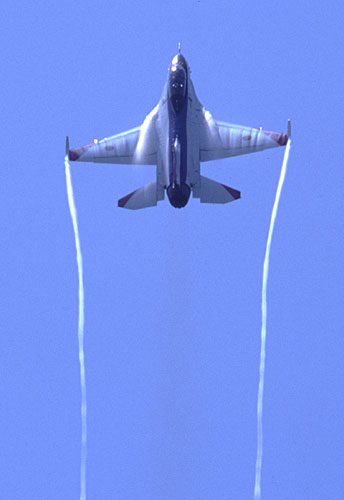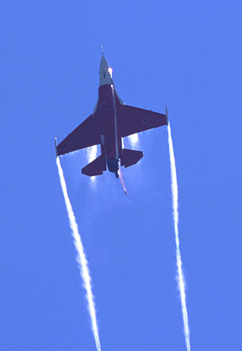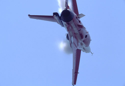 機首側面のストレーキから白い渦を引いて急旋回 |
