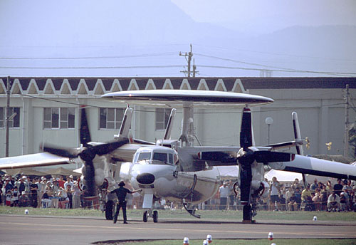 E-2Cが帰り支度で翼を展開中 |