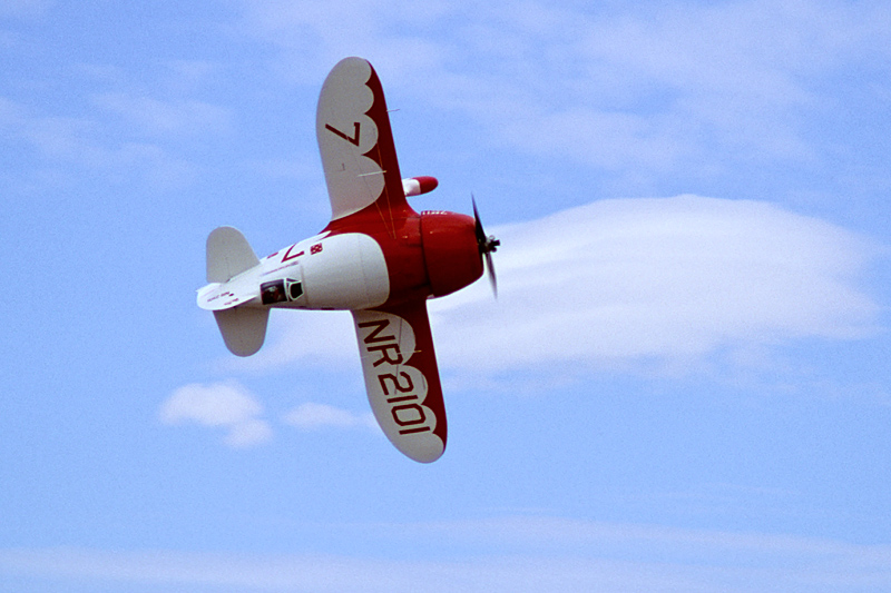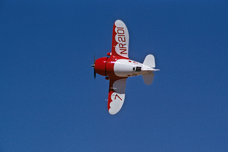 ロール中に特異な平面形を見せるGeeBee。 パイロットのDelmar Benjamin曰く、本機の操縦感覚は「ソフトクリームのコーンを指先に立てる様なもの」だとか |