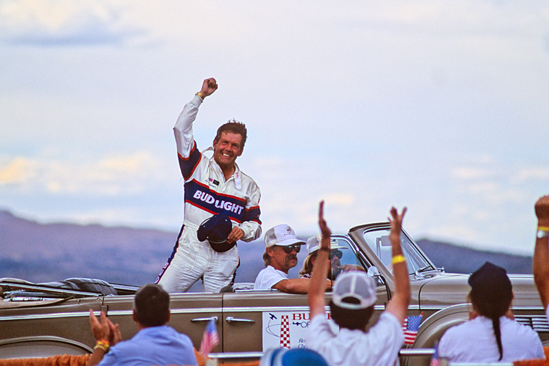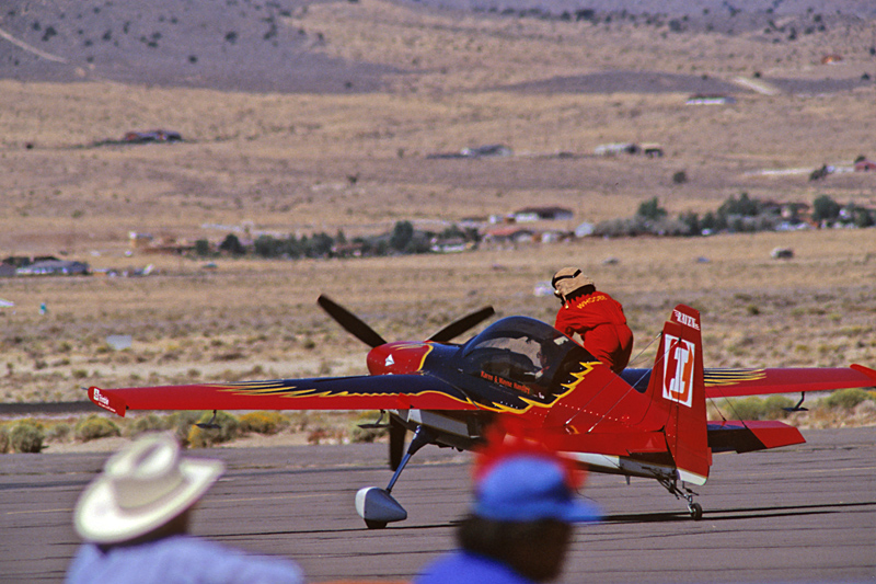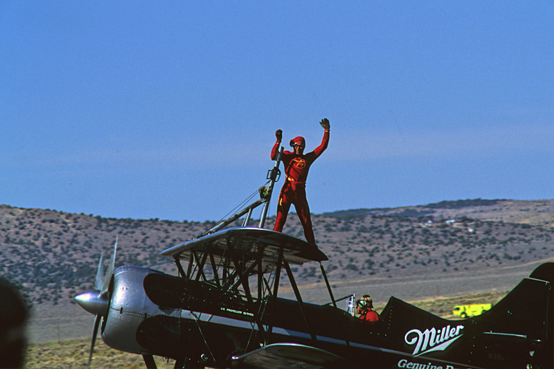 レースの勝者やフライトを終えたパフォーマーはオフィシャルの車でスタンド前を通過して喝采を受けます。この人は元全米アクロ選手権チャンピオン、Leo Loudenslager |