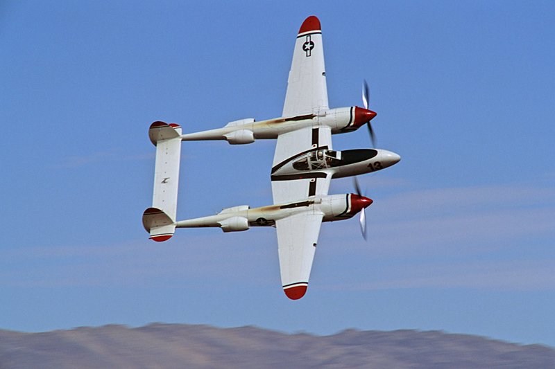 アンリミテッドクラスのレースにも出ている#13、Lefty Gardnerの"White Lightnin'"がデモ飛行。双発双胴で大柄なP-38のデモは仲々見栄えがします |