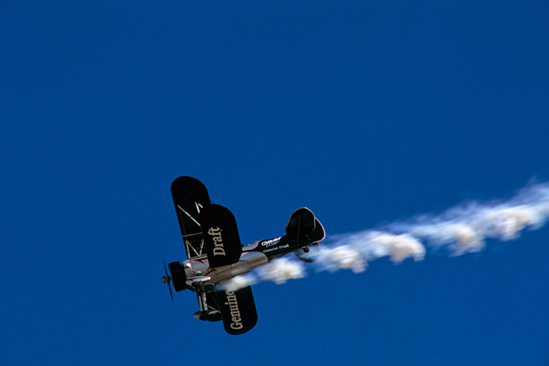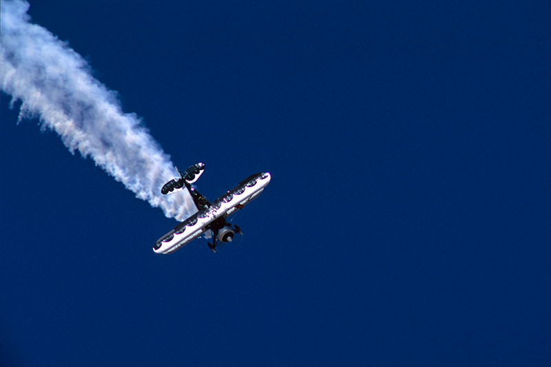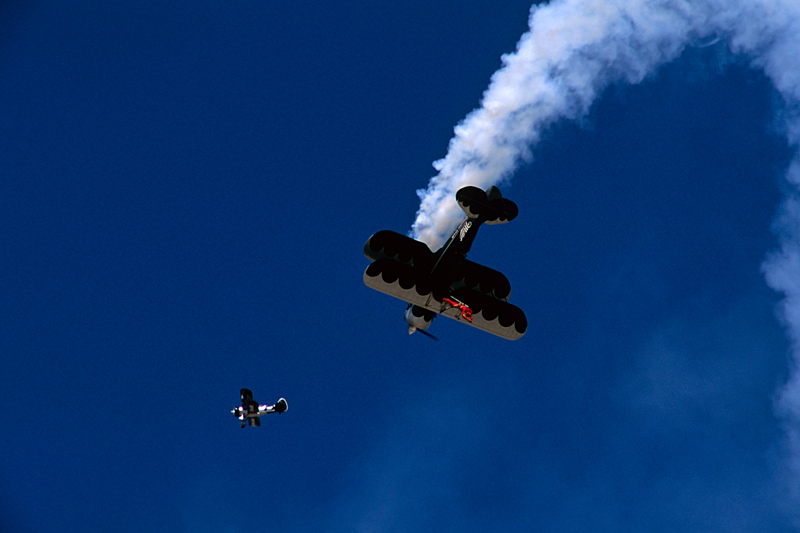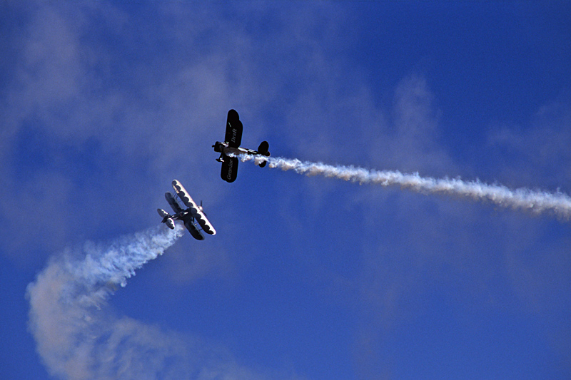 Waco複葉機によるJimmy Franklinの"Duelling Wacos"デモ。昔ながらの複葉機ではあるけれど、今でも新造機が生産されている機体 |