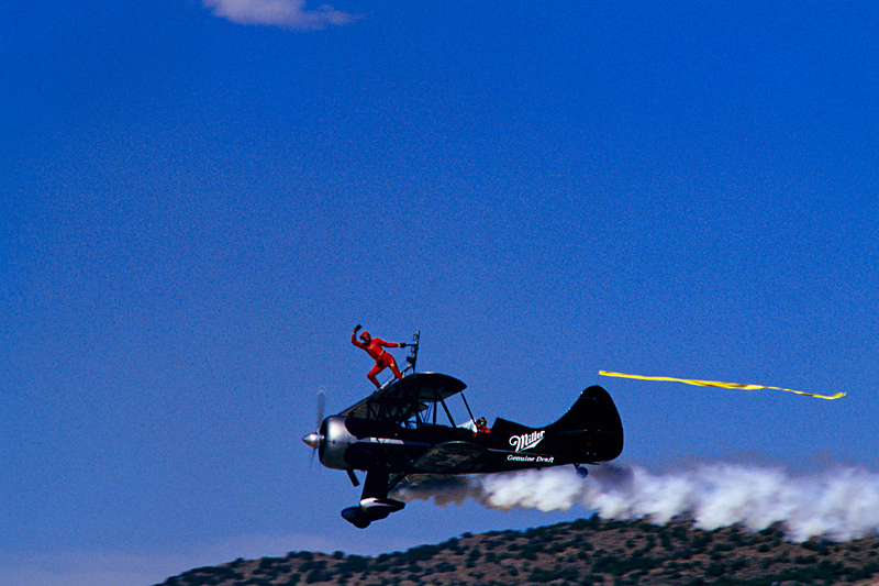 翼上で格好良くポーズを取ったり、翼の下に回り込んでぶら下がったり、パイロットと握手してみたりしていた全身タイツ男 |