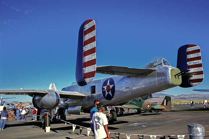 双垂直尾翼のラダーに赤白の帯が似合うB-25 |