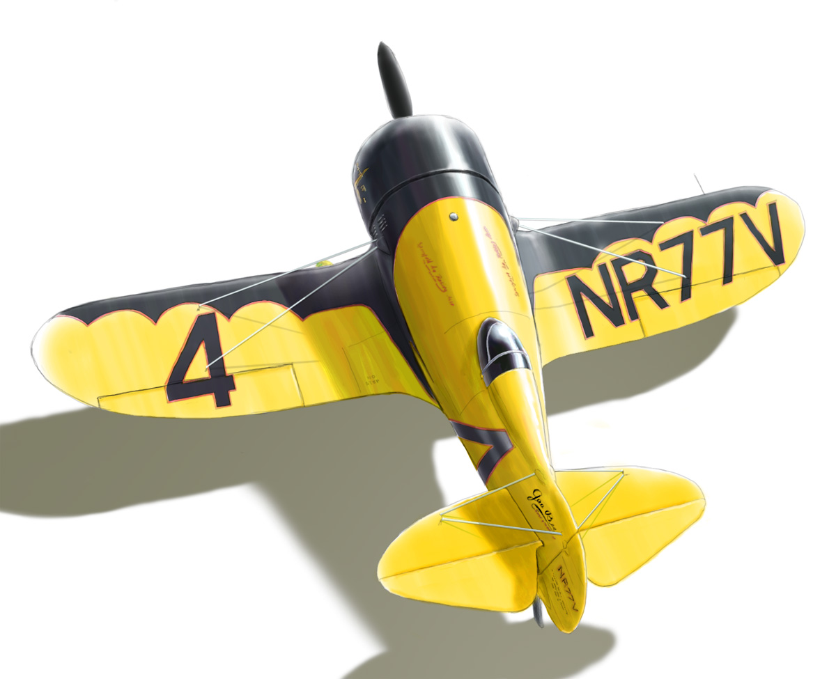 GeeBeeとはこの機体を作り上げた新興航空機メーカー、グランビル・ブラザーズ・エアクラフトから来ている名前。 長兄のザンツフォード・グランビル以下5人の兄弟で営まれていたこの会社は世界恐慌の折りの経営不振にあえいでいました。 その起死回生策として当時盛んだったレースの賞金獲得を目指し、大パワーのエンジンと当時最新の空力理論に基づいて極端に太短い胴体を組み合わせたこの機体を作り上げました。
