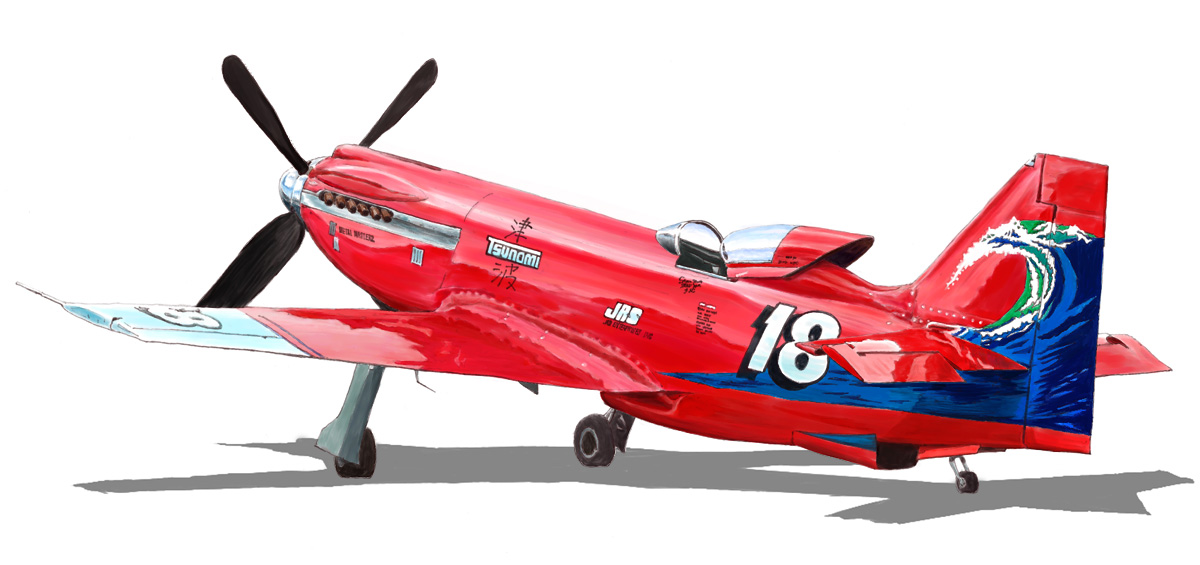 その後、'90からはパイロットをスキップ・ホルムに替えてテキサスのレースで優勝を果たし、その年のリノでは決勝で2位に食い込ました。翌年のRENO'91ではそれまでのシルバーから一転、真っ赤な塗装を纏って現れた"Tsunami"は決勝で3位ながら上位3機がそれまでのレースレコードを上回るという超高速レースを演じており、常に優勝を争う強豪の一角になっていました。