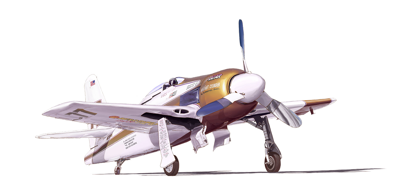 "Rare Bear" は海軍を退役後にトランスワールド航空でパイロットをしていたライル・シェルトンによって作り上げられたグラマンF8F-2ベアキャットの改造機。 リノでの優勝だけでも'73, '75, '88, '89, '90, '91, '94, '04, '05, '07の10回に及び、数々の名勝負を演じています。 また本機はピストンエンジン航空機における低空3km直線コースでの速度(850.26km/h)と0-3000mの上昇時間(1分32秒)、2つの世界記録を保持する機体でもあります。