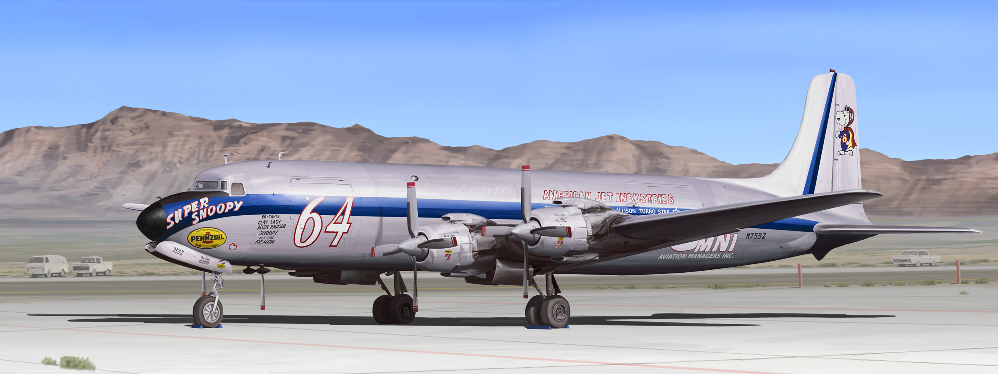 こうして前代未聞の4発旅客機パイロンレーサーが誕生しました。 レーサーとは言え機体はストックコンディションのままでしたが、強力なターボコンパウンド付きR-3350エンジン4基の合計出力は1万3000馬力に達しました。 レースナンバーは彼のP-51と同じ#64、機首に大きく愛称の "Super Snoopy" のロゴが入れられました。 スヌーピーはレイシーのP-51にも描かれている以前からの彼のマスコットで、ラダーには飛行帽を被りスーパーマンの格好をしたスヌーピーが描かれました。 彼は機内にも人の背丈ほどもあるスヌーピーのぬいぐるみを同乗させていました。 副操縦士はこの機をレイシーに提供した航空機ブローカーで、後にガルフストリーム・エアロスペースの社主となるアレン・E・ポールソンが務めました。