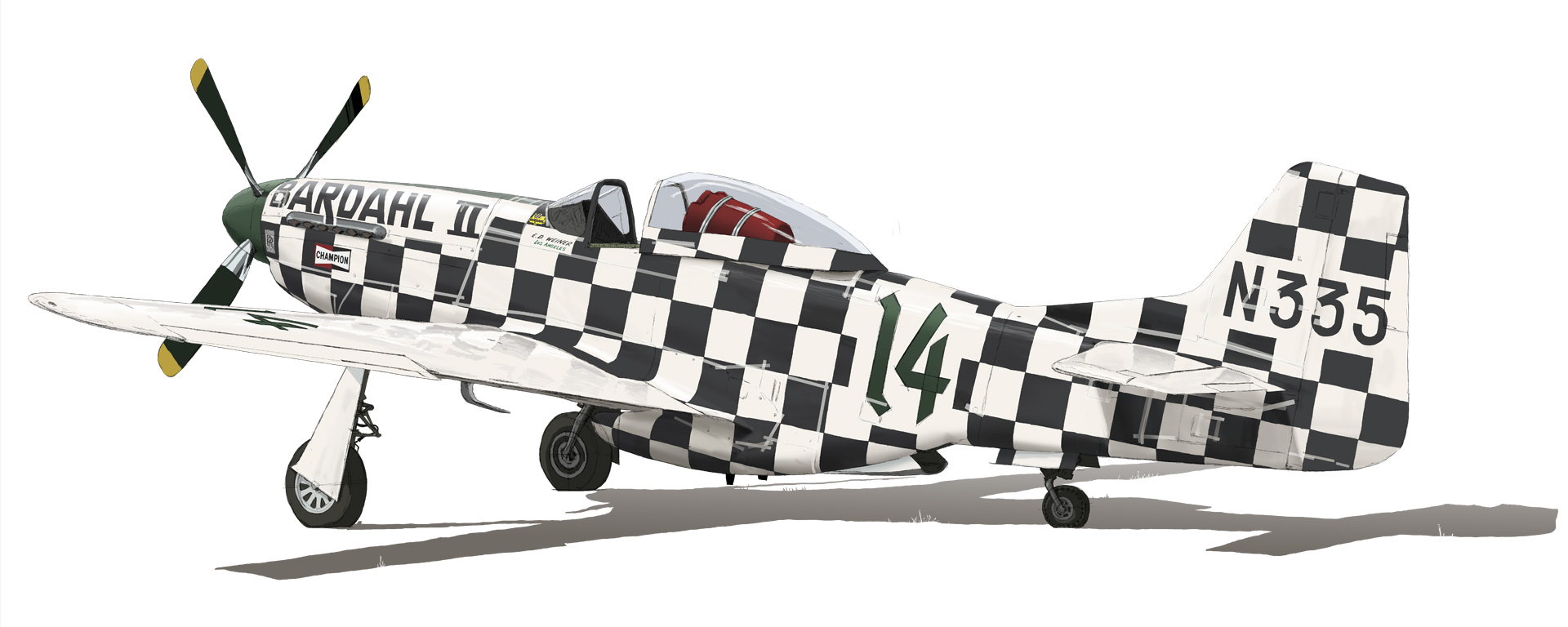 この市松模様のP-51は1960年代後半、リノでナショナルエアレースが始まった頃に活躍したE.D.ウェイナー(E.D.Weiner)の乗機です。