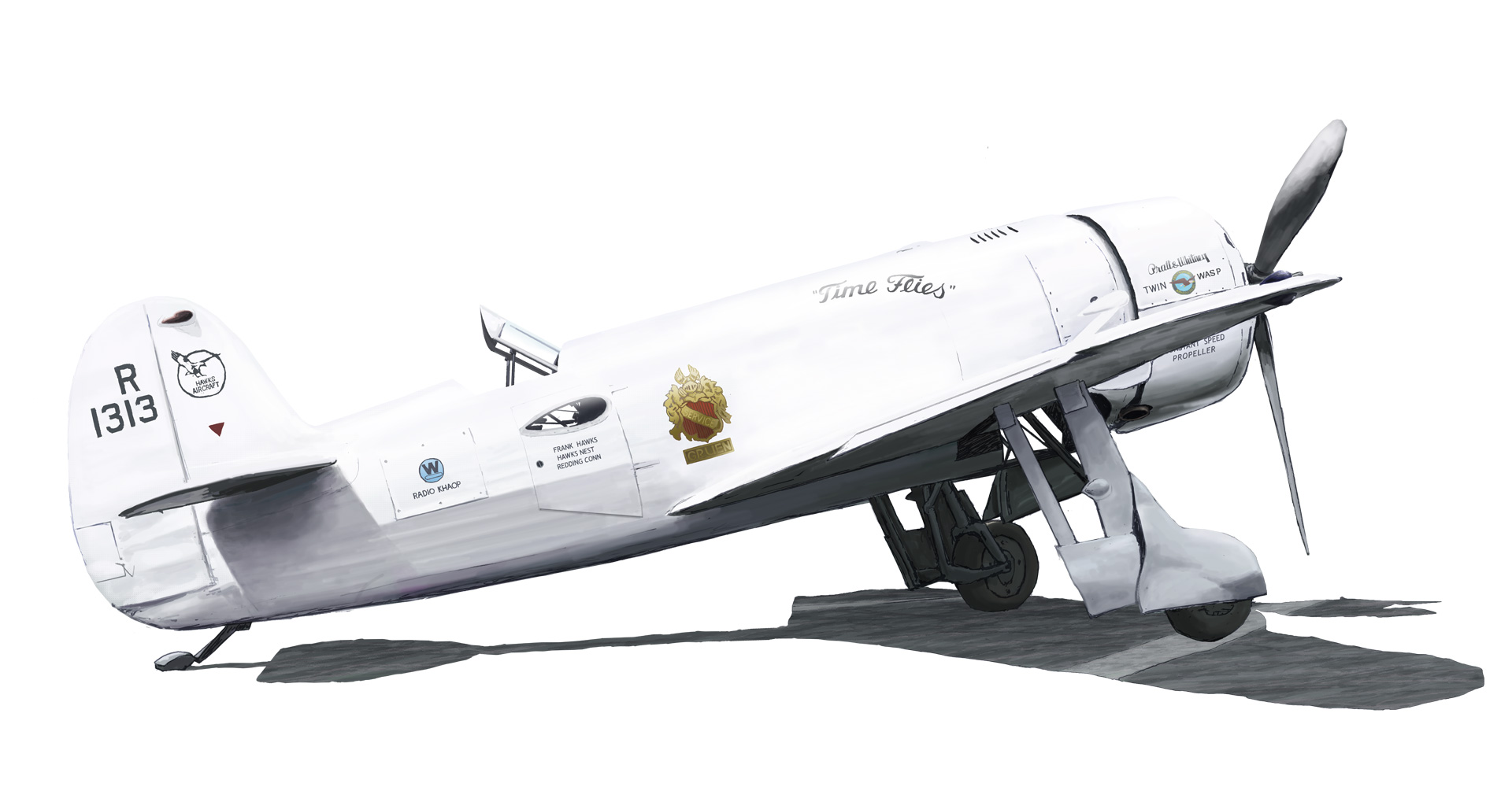 HM-1 の登録番号「NR1313」はかつてホークスが飛ばしていた"Texaco No.13" から流用され、白く塗られた胴体の側面にグリュエンのエンブレムが描かれました。 機体正面のカウリング外周を時計の文字盤に見立てた配置で "GRUEN WATCHES" と書かれましたが上の画では見えないですね。