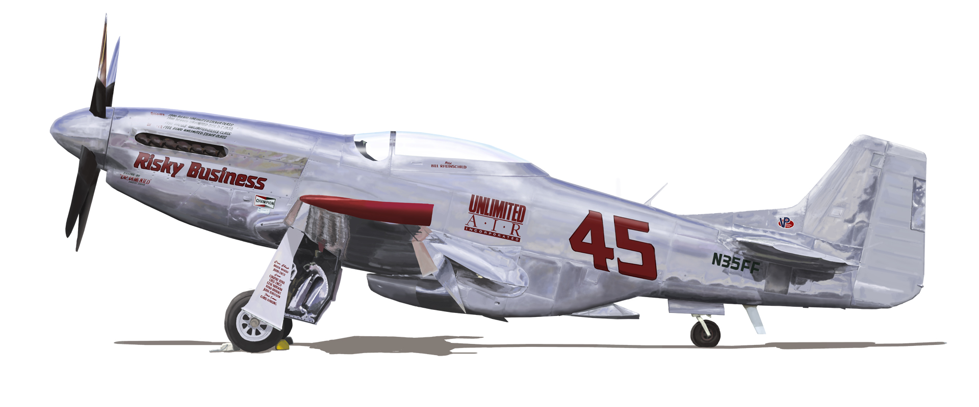 このレースナンバー#45を着けたP-51Dは元々中米のニカラグア空軍機で、退役後60年半ばに米国に移され一旦民間登録されましたが、そのあと70年代半ばまでエルサルバドル空軍機になっていた機体。 再び米国の民間機としてN35FFの登録記号を与えられ、幾人かのオーナーを経たあと、 1988年のリノ・エアレースにビル・ラインシルド (Bill "Rhino" Rheinschild) の乗機として現れたのがレース歴のはじまり。