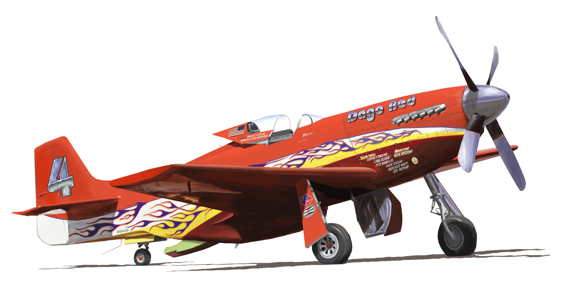 イラストは02年のリノ出場時の姿。#4の塗装はデビューからずっと赤い胴に黄色と白の帯でしたが、2000年から帯に凝ったデザインのファイアパターンが描かれ強さをより印象付ける姿になっています。 ヒストリー的には最速のレースレコードを記録した03年仕様の方が相応しいかもしれないのだけど、その年から機首のロゴが変わっているのがいまいちなのでその前年の姿としました。 02年には497.787mphで予選のクオリファイレコードを更新していますが、この記録は後に#7 ストレガに上書きされています。